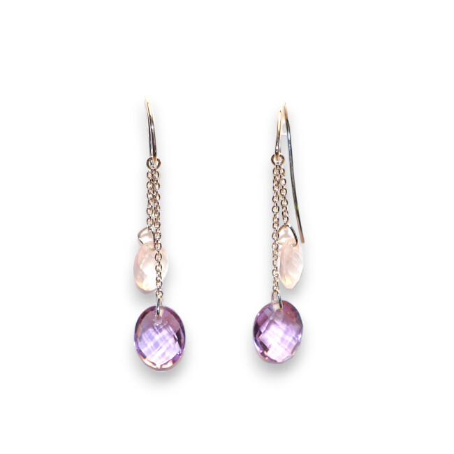 Boucles D'oreilles Pendante Or Blanc Améthyste et Quartz Rose