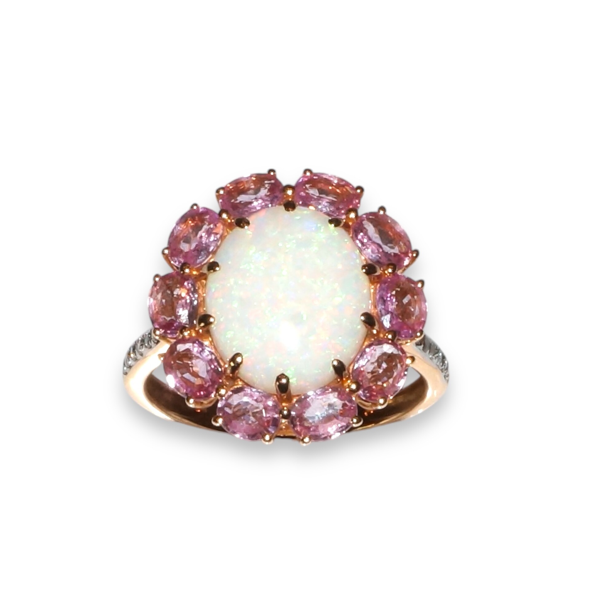 Bague Opale, Saphirs Rose & Diamants, Or Rose