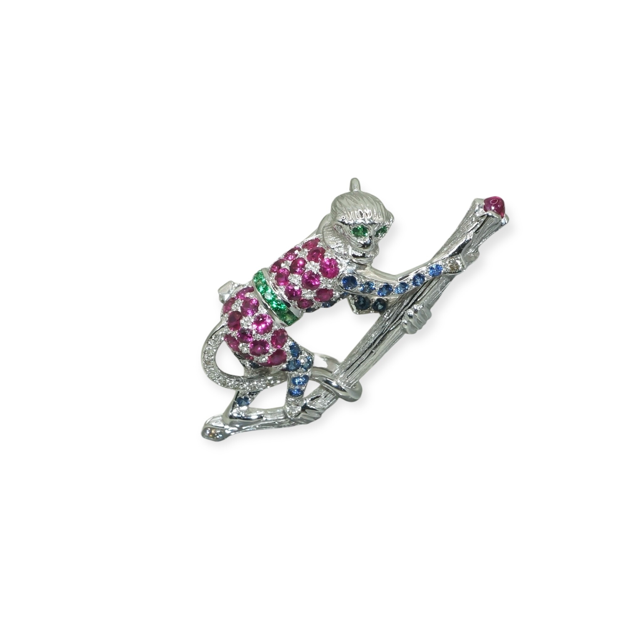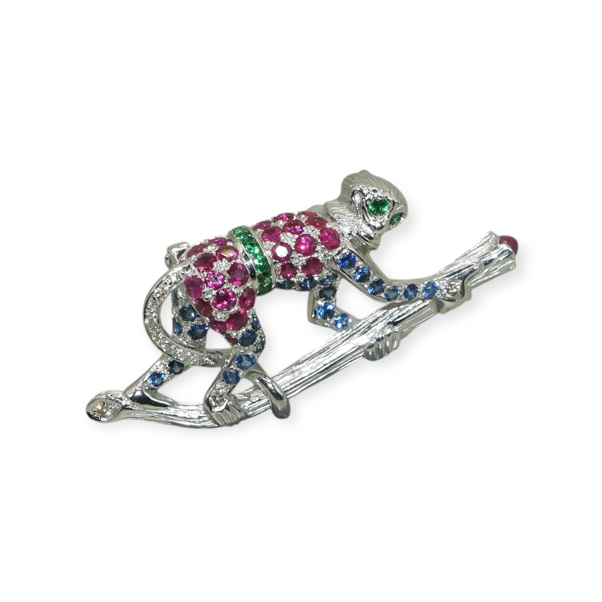 Brochette Singe, Rubis, Saphirs & Emeraude, Or Blanc